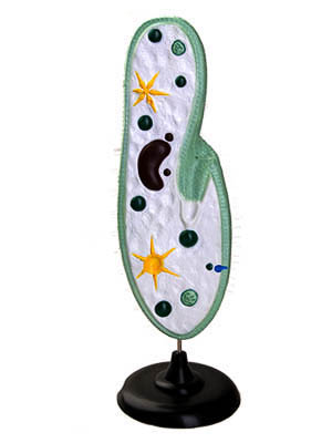 Модель изготовлена из пластмассы, раскрашена. Демонстрирует внешнее и внутреннее строение инфузории-туфельки. На модели представлены следующие детали строения простейшего: реснички, передняя сократительная вакуоль, макронуклеус (большое ядро), цитоплазма, пищеварительная вакуоль, передняя сократительная вакуоль, цитостом (рот), глотка, перистом (предротовая полость), микронуклеус (малое ядро), пелликула (наружная оболочка).