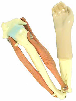 На модели изображены кости верхней конечности, мышцы сгибатели и разгибатели локтевого сустава. Длина модели около 50 см. Модель изготовлена из пластмассы, мышцы изготовлены из резины и крепятся к основе металлическими креплениями.