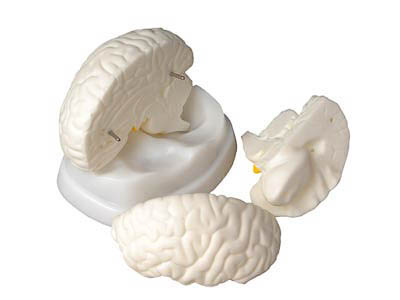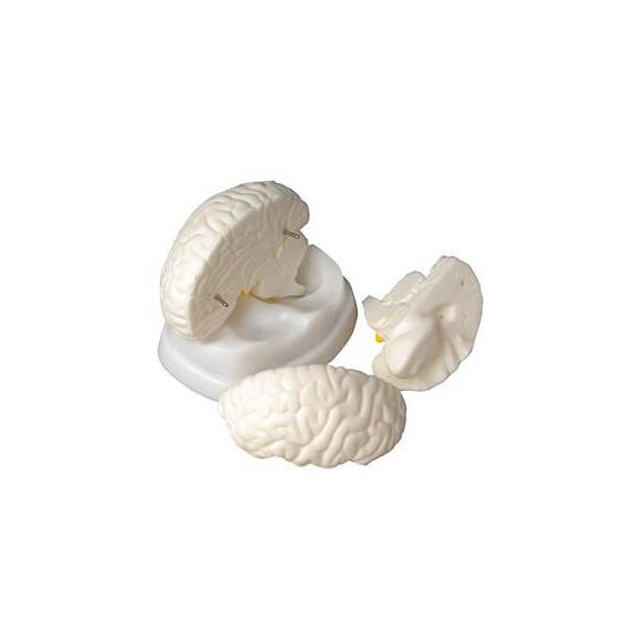 Модель изготовлена из пластмассы и снабжена пластмассовой подставкой. Модель является разборной, изображает внешнее строение головного мозга человека и его сагиттальный разрез. На модели выделены желтым цветом нервные пучки.