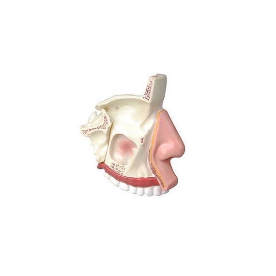 Модель высотой около 15 см изготовлена из пластмассы. Модель изображает строение носовой полости человека. Модель раскрашена в естественные цвета.