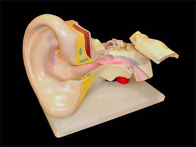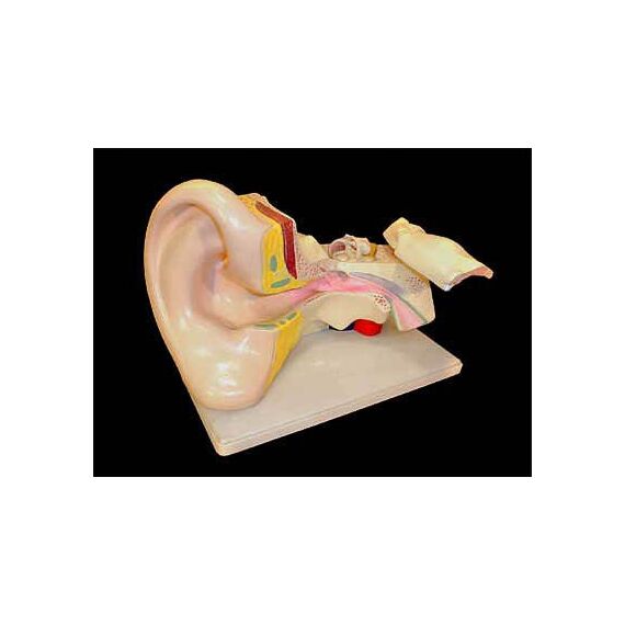 С помощью модели можно продемонстрировать следующие детали строения уха человека: 1. Ушная раковина. 2. Наружный слуховой проход. 3. Барабанная перепонка. 4. Молоточек. 5. Наковальня. 6. Стремя. 7. Слуховая труба. 8. Улитка.