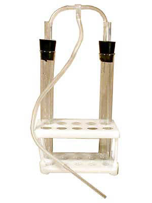 Комплектность: пробирки – 2 шт., пробки резиновые с двумя отверстиями – 2 шт., пластиковая трубка с тройником и стеклянным мундштуком – 1 шт., трубки стеклянные длинные – 2 шт., трубки стеклянные короткие – 2 шт., штатив-подставка – 1 шт., руководство по эксплуатации – 1 шт.