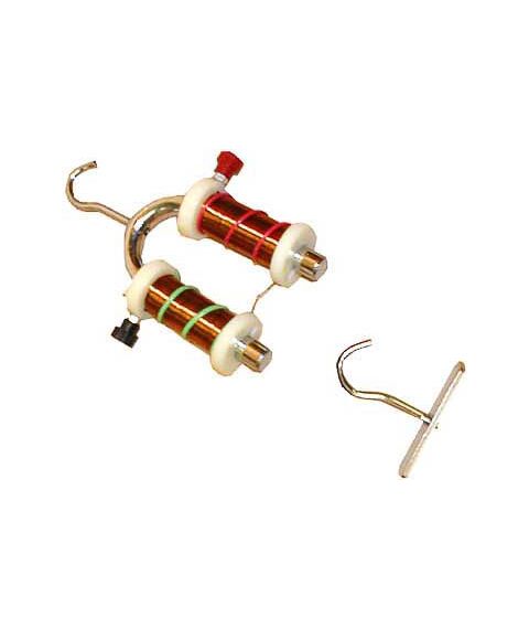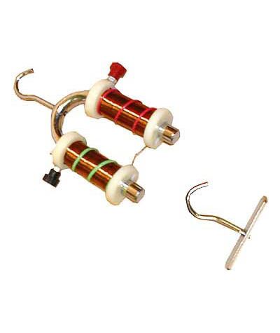Сердечник электромагнита U-образной формы изготовлен из мягкой стали. Для закрепления на штативе в сердечник ввернут крючок. На сердечник надеты две одинаковые катушки, намотанные на пластмассовые каркасы, на которых установлены зажимы для подсоединения источника питания. Катушки электромагнита соединены последовательно, общее активное сопротивление около 3 Ом. Напряжение питания электромагнита 4…6 В постоянного тока.