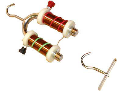 Сердечник электромагнита U-образной формы изготовлен из мягкой стали. Для закрепления на штативе в сердечник ввернут крючок. На сердечник надеты две одинаковые катушки, намотанные на пластмассовые каркасы, на которых установлены зажимы для подсоединения источника питания. Катушки электромагнита соединены последовательно, общее активное сопротивление около 3 Ом. Напряжение питания электромагнита 4…6 В постоянного тока.
