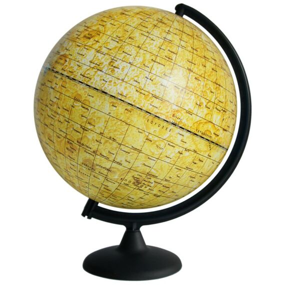 Представляет собой модель Луны с картой поверхности. На глобусе отображены элементы лунного рельефа и их названия на русском языке.