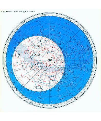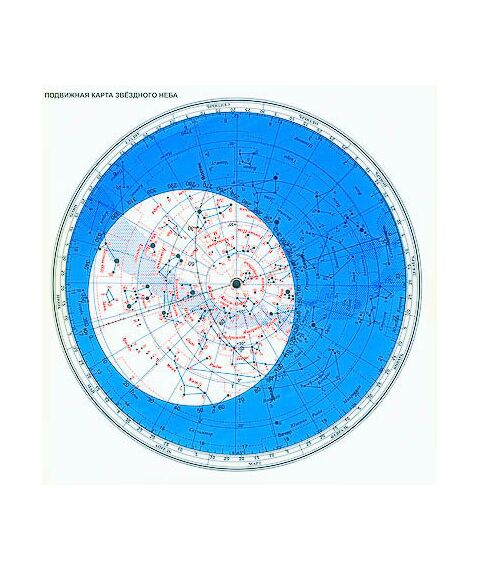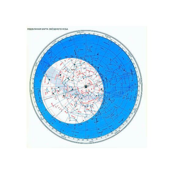 Карта состоит из двух кругов: основного и подвижного. На основной круг нанесены черными кружками звезды ярче третьей звездной величины и некоторые более слабые. Диаметры кружков отличаются в зависимости от блеска звезд. Группами точек и черточек показаны некоторые звездные скопления, туманности и галактики. Широкая голубая полоса – Млечный Путь. Границы созвездий показаны пунктирными линиями, сетка экваториальных координат (склонение δ и прямое восхождение α) – голубыми линиями. В центре Северный полюс мира. Окружность, имеющая нулевое склонение, – небесный экватор. Черная овальная линия, пересекающая небесный экватор в двух точках (весеннего и осеннего равноденствия), – эклиптика.