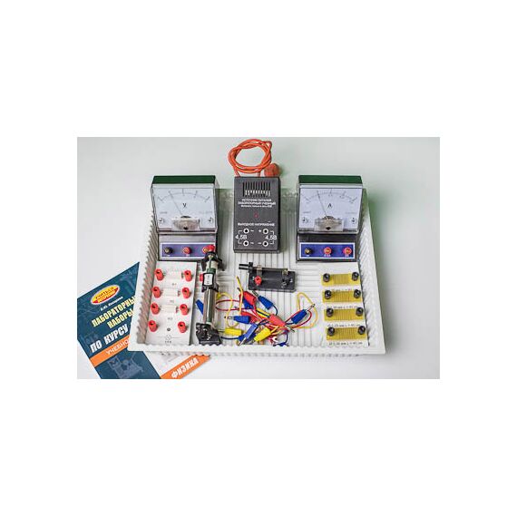 Состав комплекта: источник питания постоянного и переменного тока (4,5 В) – 1 шт., вольтметр (0–6 В, цена деления 0,2 В; 0–3 В, цена деления 0,1 В) – 1 шт., амперметр (0–3 А, цена деления 0,1 А; 0–0,6 А, цена деления 0,02 А) – 1 шт., резистор с обозначением R1, сопротивление (4,7±0,5) Ом - 1 шт., резистор с обозначением R2, сопротивление (5,7±0,6) Ом - 1 шт., резистор с обозначением R3, сопротивление (8,2±0,8) Ом - 1 шт., набор проволочных резисторов plS (резисторы обеспечивают проведение исследования зависимости сопротивления от длины, площади поперечного сечения и удельного сопротивления проводника) - 1 шт., лампочка с номинальным напряжением 4,5 В, сила тока 0,5 А - 1 шт., переменный резистор (реостат), сопротивление 10 Ом - 1 шт., соединительные провода - 10 шт., ключ - 1 шт., лоток пластиковый размером 340*270*55 мм - 1 шт., учебное пособие «Лабораторные наборы по курсу физики» (автор Е.Ю. Косарева – 68 страниц – печать офсетная, обложка полноцветная) – 1 шт., руководство по эксплуатации - 1 шт.