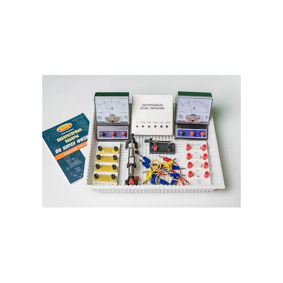 Состав комплекта: батарейный блок питания 1,5 ÷7,5 В (регулируемый) – 1 шт., батарейки (тип АА) – 5 шт., вольтметр (0–6 В, цена деления 0,2 В; 0–3 В, цена деления 0,1 В) – 1 шт., амперметр (0–3 А, цена деления 0,1 А; 0–0,6 А, цена деления 0,02 А) – 1 шт., резистор с обозначением R1, сопротивление (4,7±0,5) Ом - 1 шт., резистор с обозначением R2, сопротивление (5,7±0,6) Ом - 1 шт., резистор с обозначением R3, сопротивление (8,2±0,8) Ом - 1 шт., набор проволочных резисторов plS (резисторы обеспечивают проведение исследования зависимости сопротивления от длины, площади поперечного сечения и удельного сопротивления проводника) - 1 шт., лампочка с номинальным напряжением 4,5 В, сила тока 0,5 А - 1 шт., переменный резистор (реостат), сопротивление 10 Ом - 1 шт., соединительные провода - 10 шт., ключ - 1 шт., лоток пластиковый размером 340*270*55 мм - 1 шт., учебное пособие «Лабораторные наборы по курсу физики» (автор Е.Ю. Косарева – 68 страниц – печать офсетная, обложка полноцветная) – 1 шт., руководство по эксплуатации - 1 шт.
