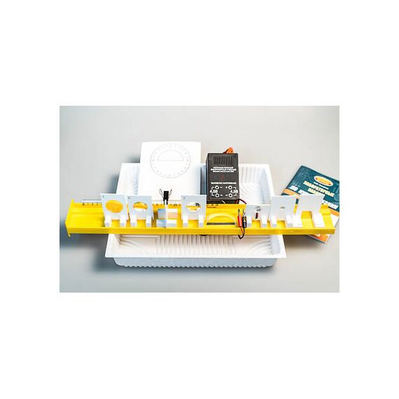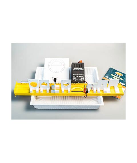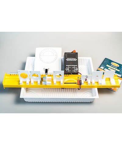 Состав комплекта: источник питания постоянного и переменного тока (4,5 В) – 1 шт., собирающая линза № 1, фокусное расстояние F1=(100±10) мм - 1 шт., собирающая линза № 2, фокусное расстояние F2=(50±5) мм - 1 шт., рассеивающая линза № 3, фокусное расстояние F3=-(75±5) мм - 1 шт., линейка длиной 300 мм с миллиметровыми делениями - 1 шт., экран с держателем - 1 шт., направляющая (оптическая скамья пластиковая с бортиками для соосности оптических элементов и фиксатором для края стола) - 1 шт., осветитель-светодиод белого света с двумя проводами (красным и черным) - 1 шт., фиксатор провода к оптической скамье - 1 шт., слайд "Модель предмета" (буква F) - 1 шт., щель - 1 шт., полуцилиндр, диаметр (50±5) мм, показатель преломления примерно 1,5 - 1 шт., планшет с круговым транспортиром и с обозначением места для полуцилиндра - 1 шт., лоток пластиковый размером 340*270*55 мм - 1 шт., учебное пособие «Лабораторные наборы по курсу физики» (автор Е.Ю. Косарева – 68 страниц – печать офсетная, обложка полноцветная) – 1 шт., руководство по эксплуатации - 1 шт.
