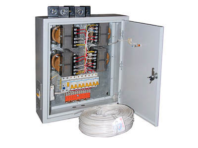 В комплект входят: щит распределительный в упаковке (с паспортом) – 1 шт., розетка электрическая 42 В – 16 шт., провод электрический – 100 м., коробка для провода и розеток – 1 шт., руководство по эксплуатации – 1 шт.