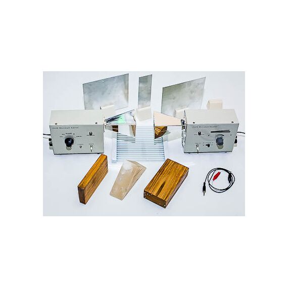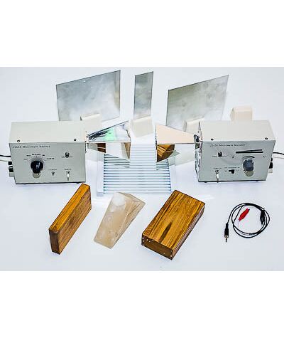 Комплектность: блок СВЧ-генератора с предохранителем – 1 шт., блок приемника – 1 шт., металлический экран (пластина-экран из дюралюминия) – 3 шт., металлическая решетка – 1 шт., бруски из дерева – 2 шт., парафиновая равнобедренная призма (поглощающий экран) – 1 шт., пластмассовые подставки для пластин-экранов (держатели экрана) – 4 шт., провод (кабель связи) – 1 шт., руководство по эксплуатации – 1 шт.