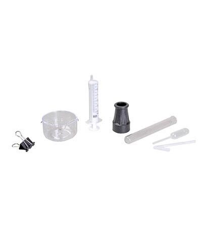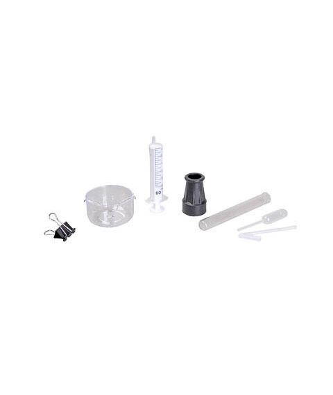 Комплектность: пластиковая прозрачная чаша с металлической петлей – 1 шт., резиновая насадка с цилиндрическим отверстием – 1 шт., шприц на 10 см3 – 1 шт., пипетка – 1 шт., пробирка – 1 шт., трубка силиконовая (L = 20 мм Ø = 3,4 мм) – 1 шт., трубка пластиковая (L = 80 мм Ø = 2,5 мм) – 1 шт., зажим канцелярский – 1 шт., руководство по эксплуатации – 1 шт.