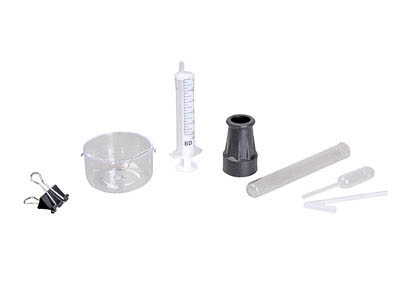 Комплектность: пластиковая прозрачная чаша с металлической петлей – 1 шт., резиновая насадка с цилиндрическим отверстием – 1 шт., шприц на 10 см3 – 1 шт., пипетка – 1 шт., пробирка – 1 шт., трубка силиконовая (L = 20 мм Ø = 3,4 мм) – 1 шт., трубка пластиковая (L = 80 мм Ø = 2,5 мм) – 1 шт., зажим канцелярский – 1 шт., руководство по эксплуатации – 1 шт.