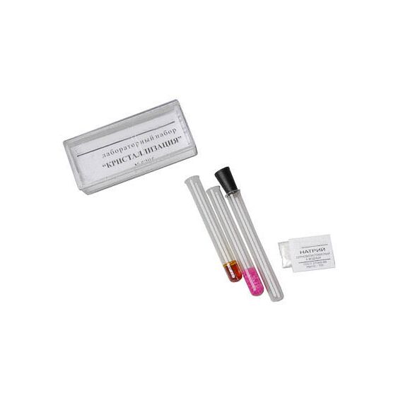 Комплектность: пробирки стеклянные 14*120 мм с веществами желтого и розового цвета (канифоль и парафин) и пустая – 3 шт., пробка – 1 шт., пакет с кристаллами серноватистокислого 5-водного натрия – 1 шт., руководство по эксплуатации – 1 шт.