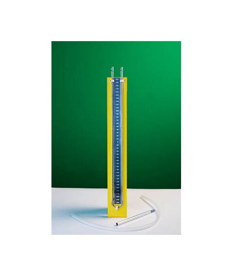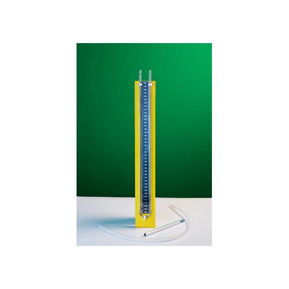 Прибор представляет собой U-образную стеклянную трубку, укрепленную на пластине со шкалой с делениями через 5 мм и нулем посередине. Для закрепления прибора в лапке штатива в скобу на обратной стороне вкручивается винт.