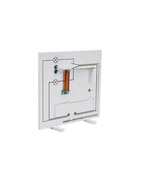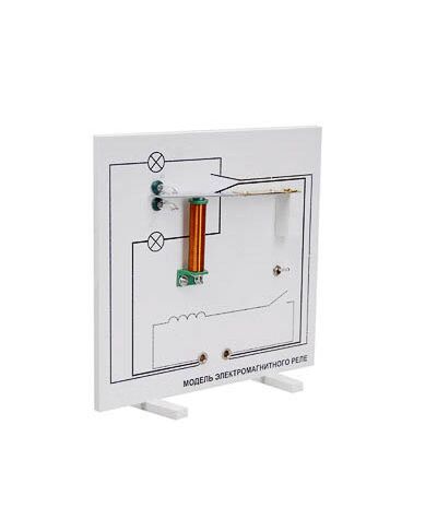 Реле смонтировано на изолирующей панели таким образом, что хорошо видны все его детали. Реле состоит из электромагнита, стальной подпружиненной пластины и выключателя. На панели установлены клеммы для подключения источника питания и лампы для демонстрации работы реле. Также на панели указаны схемы электрических цепей, по которым течет ток при демонстрации работы реле. Панель укреплена на поворотных ножках для демонстрации прибора в вертикальном положении.
