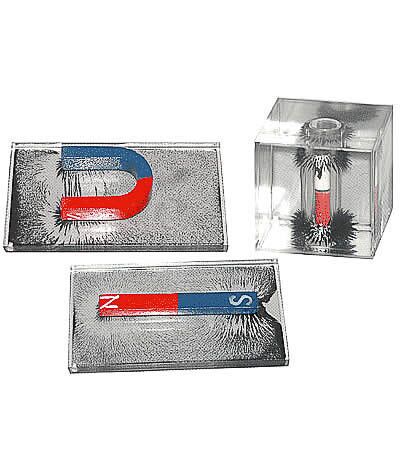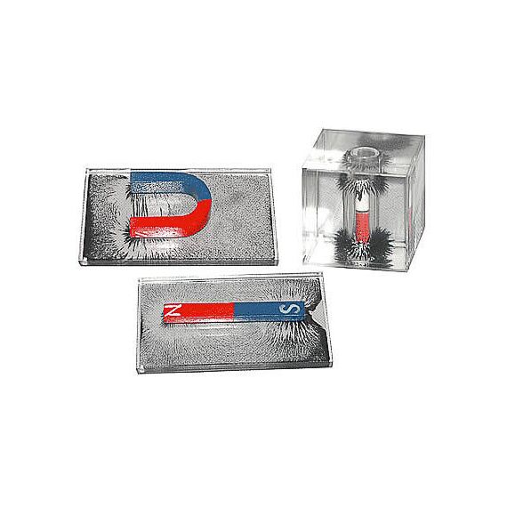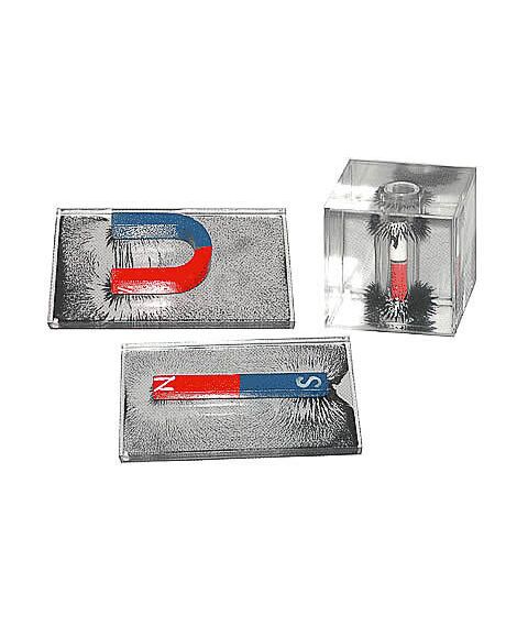 Набор состоит из прозрачных плоского планшета и куба с вязкой прозрачной жидкостью с мелким магнитным порошком, постоянных полосового и U-образного магнитов. В центр куба вставлен круглый постоянный магнит для демонстрации индукции магнитного поля в пространстве.