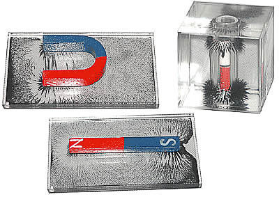 Набор состоит из прозрачных плоского планшета и куба с вязкой прозрачной жидкостью с мелким магнитным порошком, постоянных полосового и U-образного магнитов. В центр куба вставлен круглый постоянный магнит для демонстрации индукции магнитного поля в пространстве.