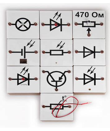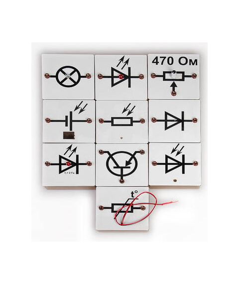 Комплектность: модуль солнечного элемента питания – 1 шт., модуль терморезистора – 1 шт., модуль фоторезистора – 1 шт., модуль диода – 1 шт., модуль светодиода постоянного свечения – 1 шт., модуль мигающего светодиода – 1 шт., модуль фотодиода – 1 шт., модуль транзистора – 1 шт., модуль низковольтной лампочки – 1 шт., модуль переменного резистора – 1 шт., руководство по эксплуатации – 1 шт.