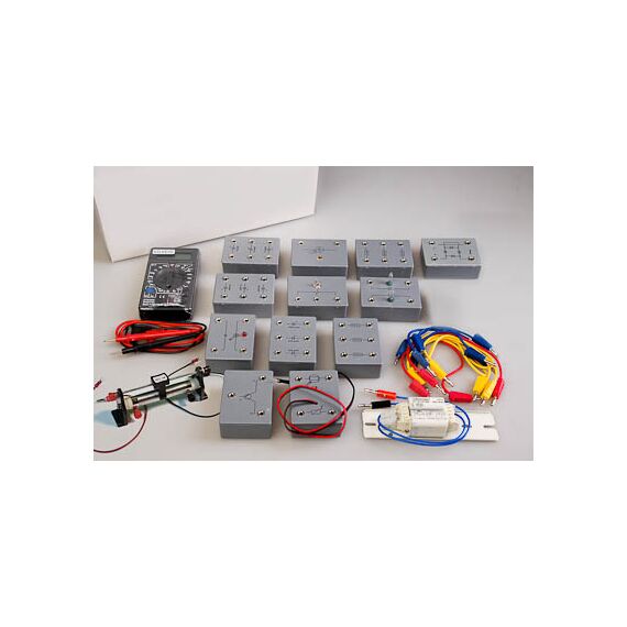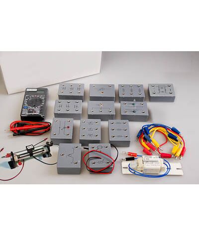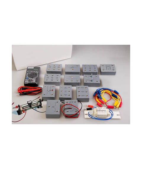 Для удобства сборки электрических цепей все элементы вмонтированы в пластиковые модули (по одному, два или три элемента в одном модуле) с клеммами под провода. Дно модуля с переменным резистором выполнено из прозрачного пластика.