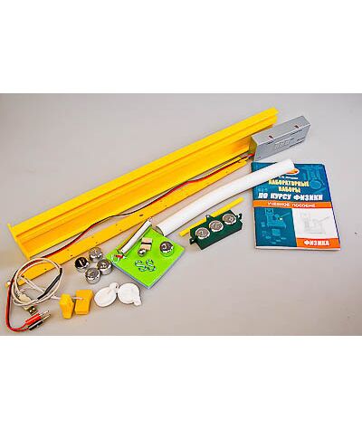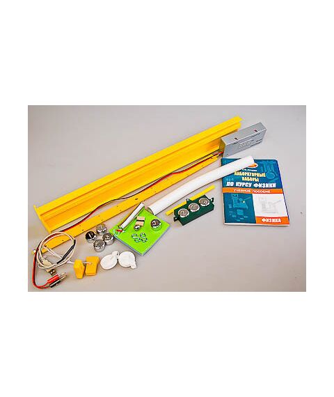 Комплектность: направляющая рейка – 1 шт., каретка – 1 шт., электронный секундомер с двумя датчиками – 1 шт., желоб дугообразный – 1 шт., рычаг-линейка – 1 шт., блоки – 2 шт., проволочные крючки – 2 шт., пластиковый коврик – 1 шт., грузы по 50 г – 8 шт., пружина – 1 шт., стальной шарик – 1 шт., лист копировальной бумаги – 1 шт., нить на каркасе – 1 шт., учебное пособие «Лабораторные наборы по курсу физики» (автор Е.Ю. Косарева – 68 страниц – печать офсетная, обложка полноцветная) – 1 шт., руководство по эксплуатации – 1 шт.