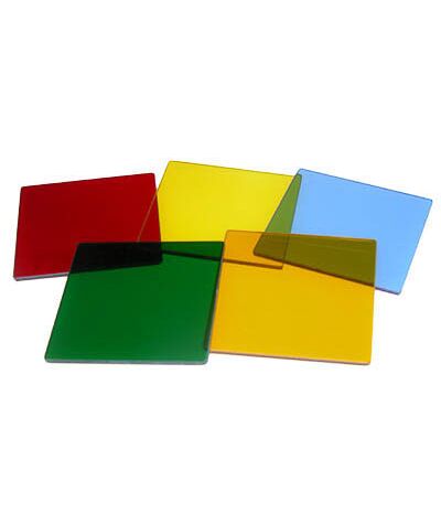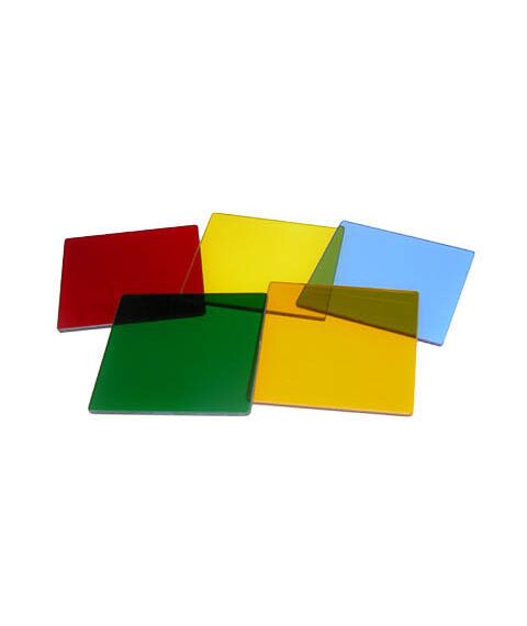Набор состоит из 5 прозрачных пластин красного, оранжевого, желтого, зеленого и синего цвета, уложенных в коробку. Размеры пластин 50*50 мм.
