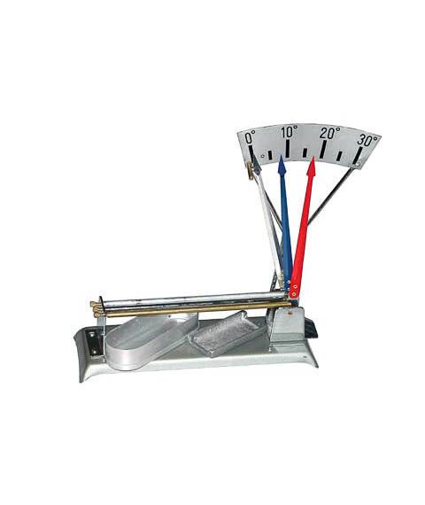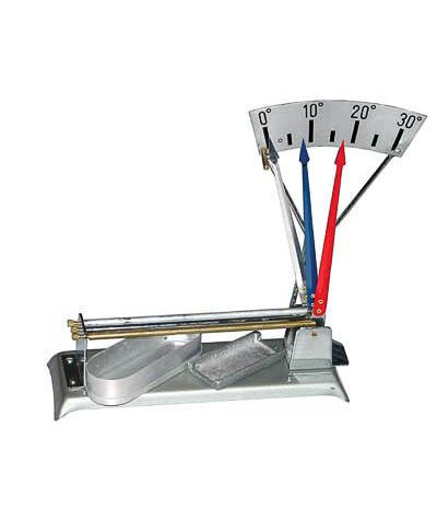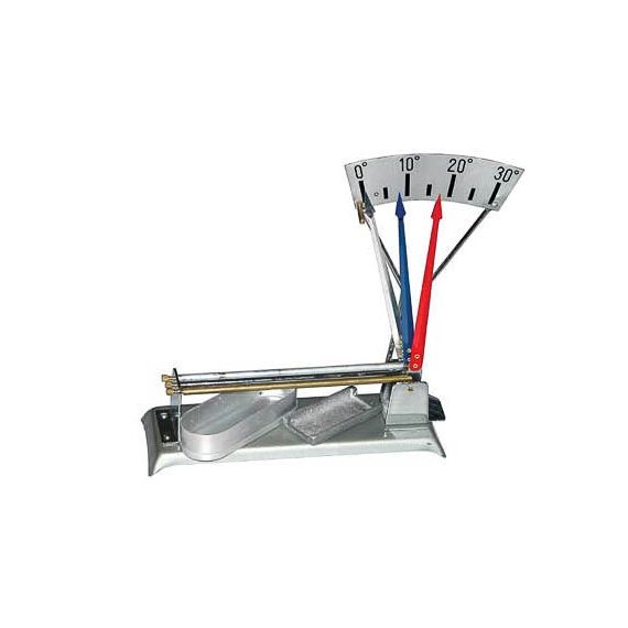 Прибор состоит из профильного металлического основания, на котором слева закреплен неподвижный упор с регулировочными винтами справа – обойма, в верхней части которой ось с тремя стрелками разного цвета: светлая, синяя, красная. На обойме закреплена проволочная вилка, в верхней части которой размещена шкала с градусными делениями от 0 до 30°С. Цена деления шкалы – 5°С. Верхние концы стрелок опираются на горизонтальный проволочный упор, а нижние – оттягиваются спиральными пружинами.