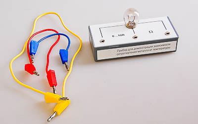 Прибор представляет собой двухспиральную электрическую лампу с патроном, смонтированным на пластмассовой подставке, на которой также установлены универсальные зажимы для подключения регулируемого по напряжению источника тока (может использоваться источник питания демонстрационный ИПД-С или В-24) и омметра. Максимальное напряжение питания нагревательной спирали – 12 В.