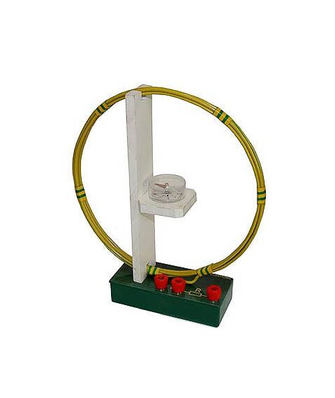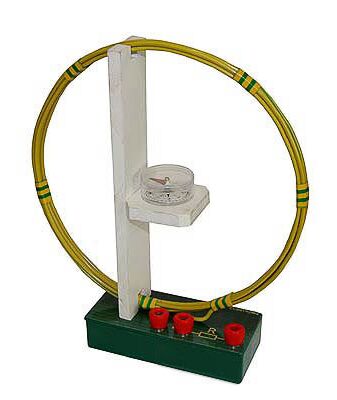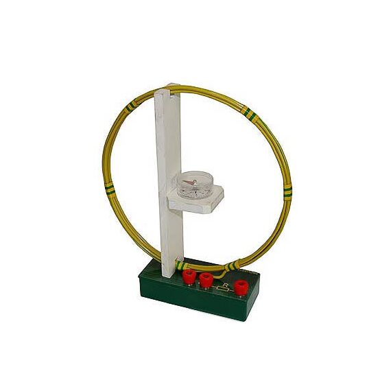 Прибор состоит из катушки диаметром 0,21 м (6 витков провода), компаса и резистора; установлен на подставке.