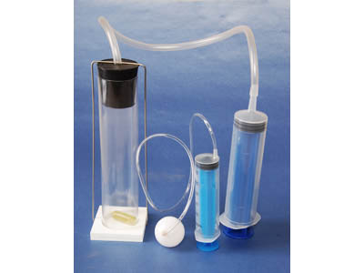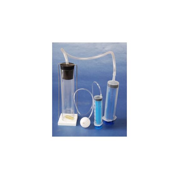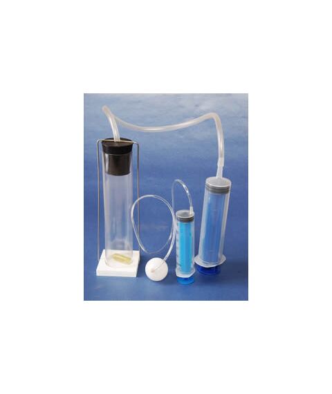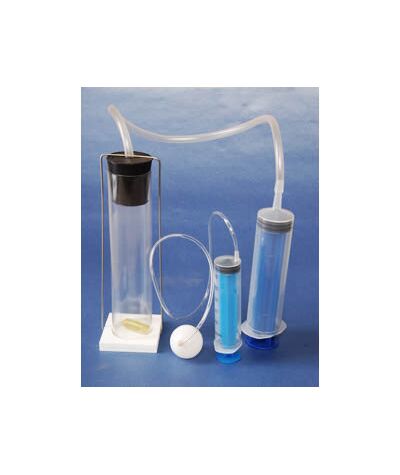 В комплект входят: пластиковый цилиндр с подставкой – 1 шт., пробка – 1 шт., поплавок с песком – 1 шт., соединительная трубка – 2 шт., насос-шприц – 2 шт., пластиковый полый шар с отверстием – 1 шт., руководство по эксплуатации – 1 шт.