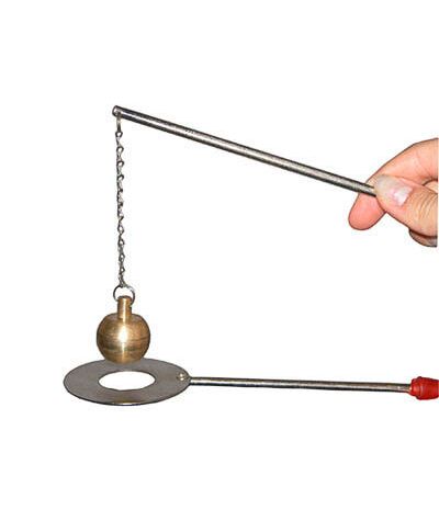 Шар и кольцо изготовлены из металла, снабжены держателями, выполненными из термоизоляционного материала. Шар свободно проходит через кольцо при их одинаковой температуре. При нагревании шара он расширяется и застревает в кольце.