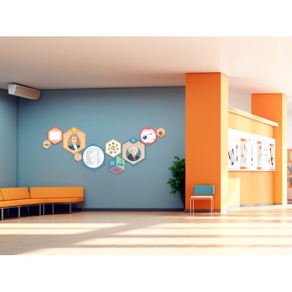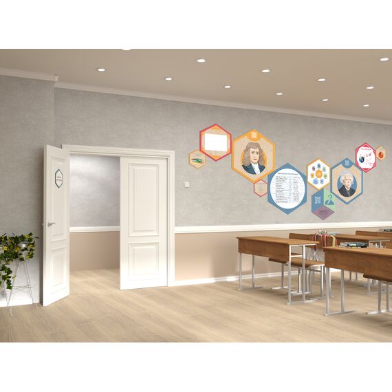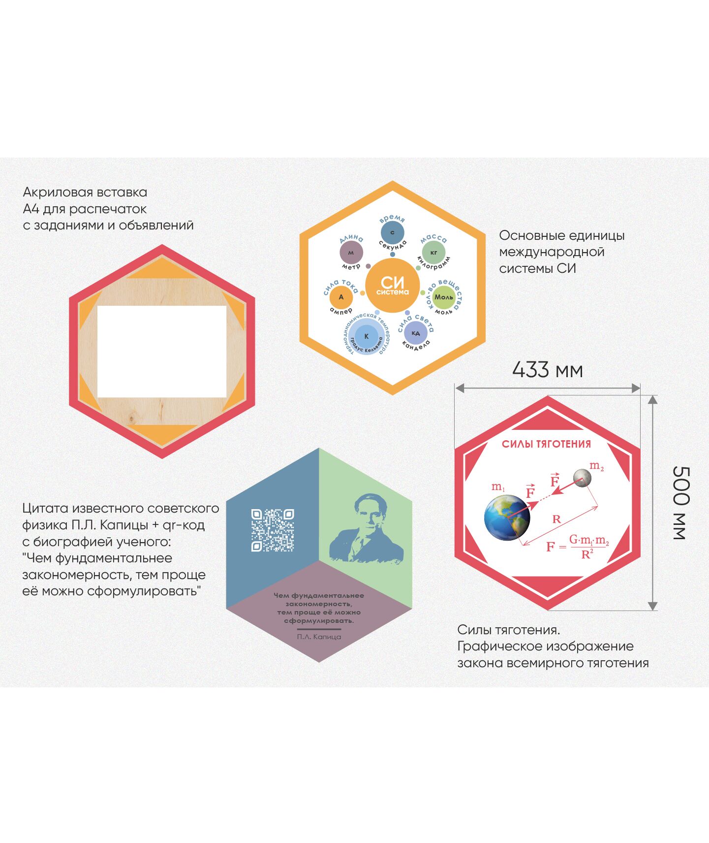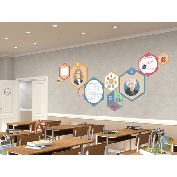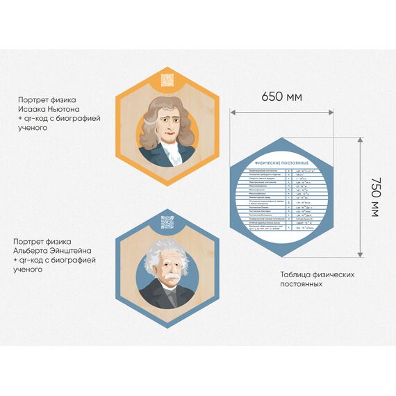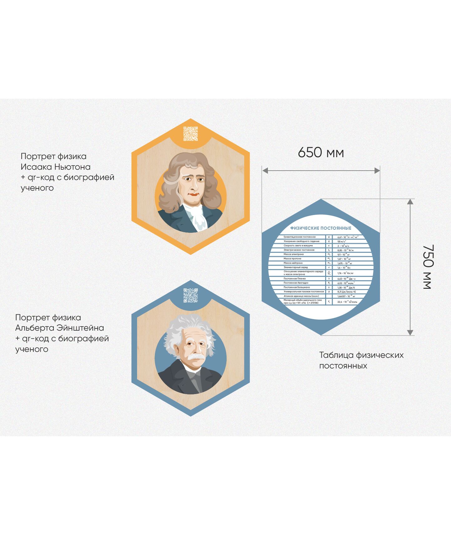 Каждый шестигранник содержит обучающую информацию: портреты выдающихся людей, их достижения и великие цитаты, основные постулаты науки, формулы, графики, теоремы. Благодаря qr-кодам дети могут подробнее узнать об учёных, изображённых на портретах, стоит только навести на них телефон.