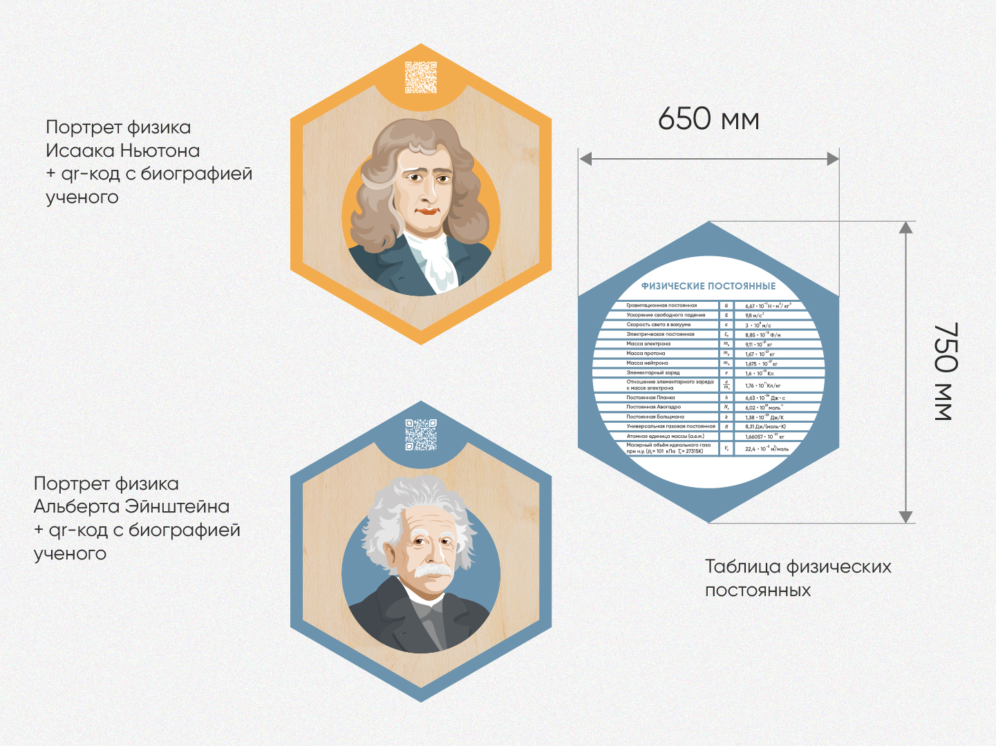 Каждый шестигранник содержит обучающую информацию: портреты выдающихся людей, их достижения и великие цитаты, основные постулаты науки, формулы, графики, теоремы. Благодаря qr-кодам дети могут подробнее узнать об учёных, изображённых на портретах, стоит только навести на них телефон.