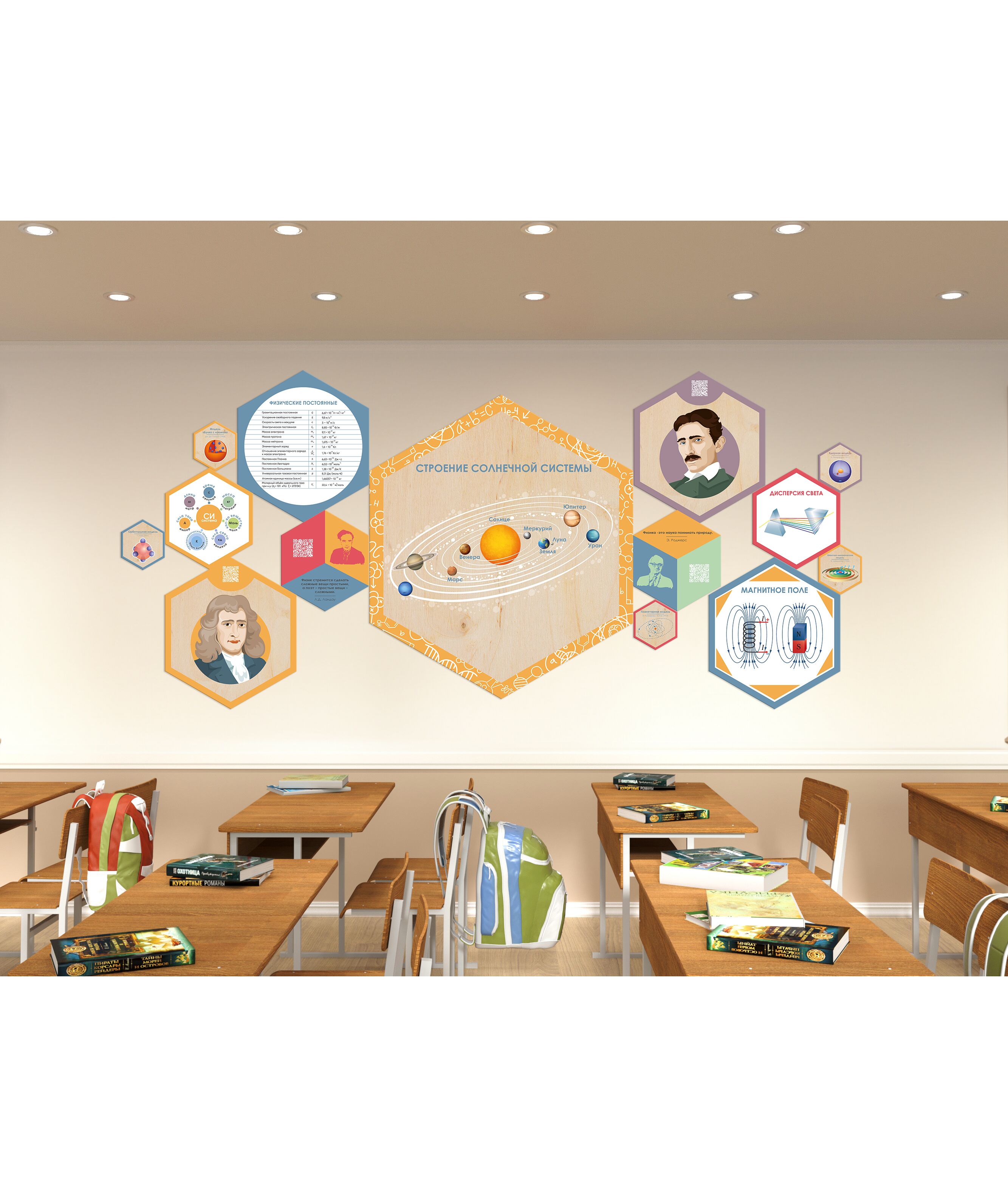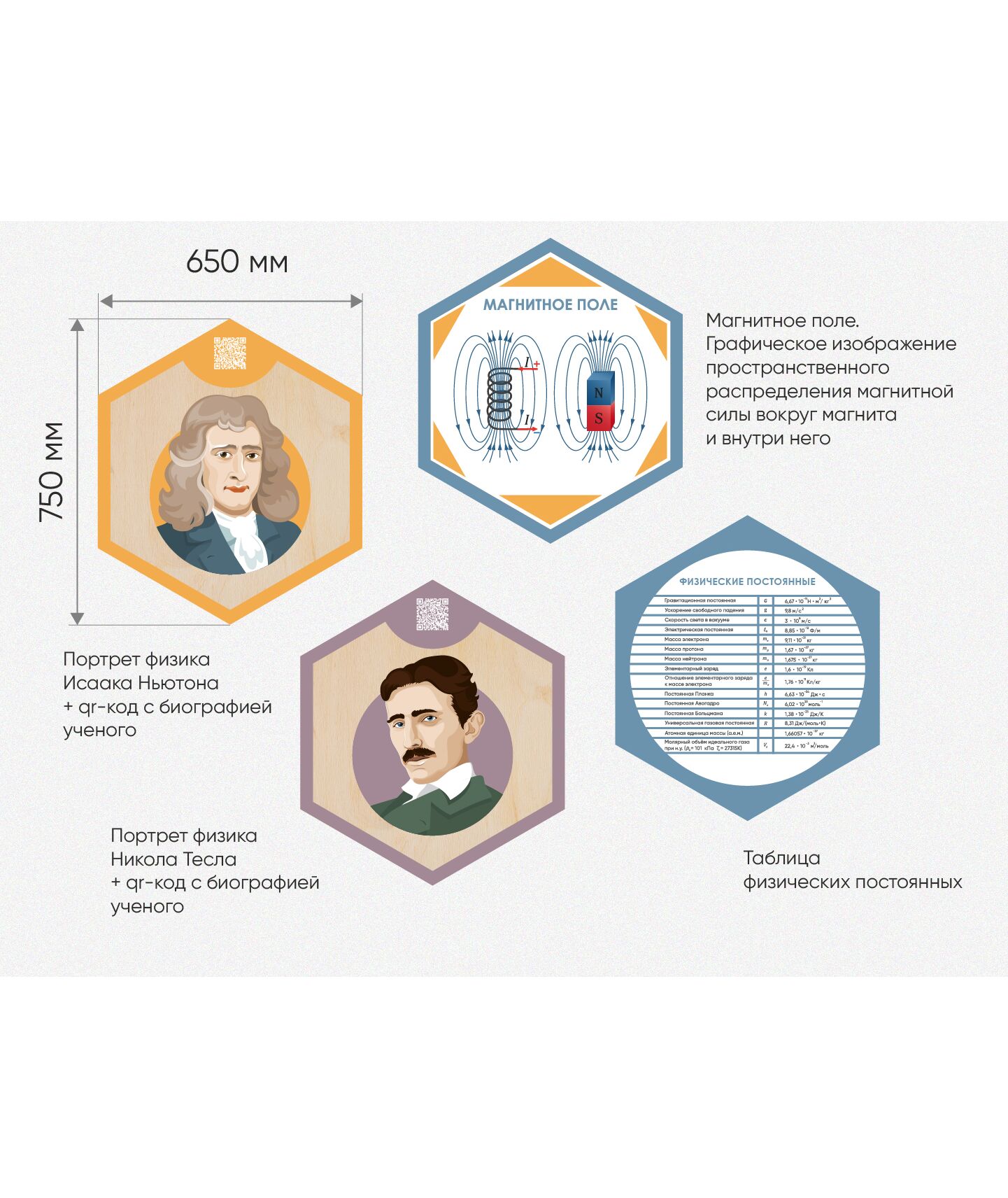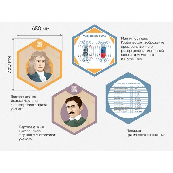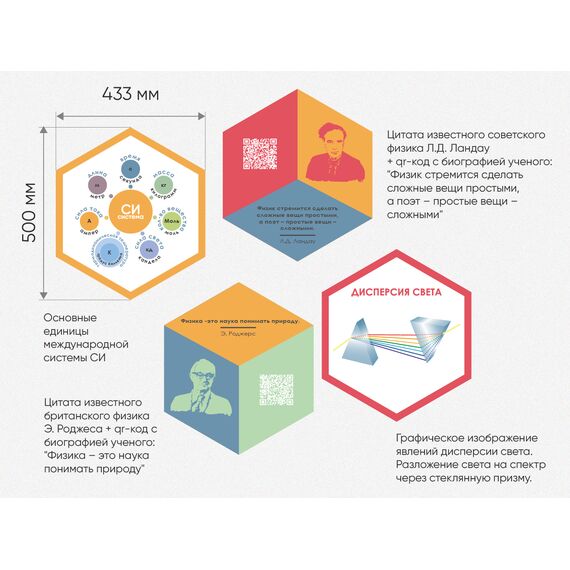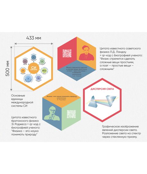Каждый шестигранник содержит обучающую информацию: портреты выдающихся людей, их достижения и великие цитаты, основные постулаты науки, формулы, графики, теоремы. Благодаря qr-кодам дети могут подробнее узнать об учёных, изображённых на портретах, стоит только навести на них телефон.