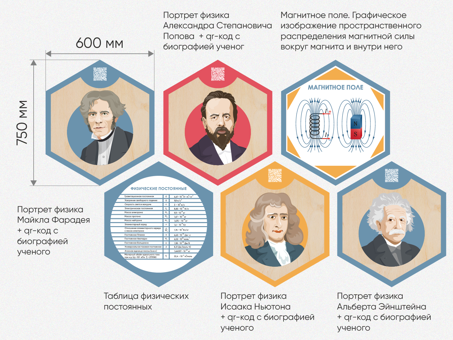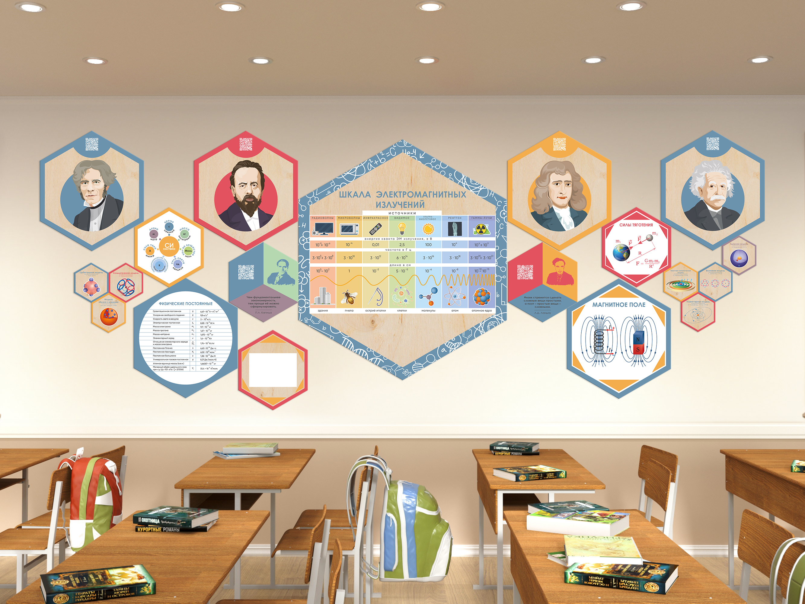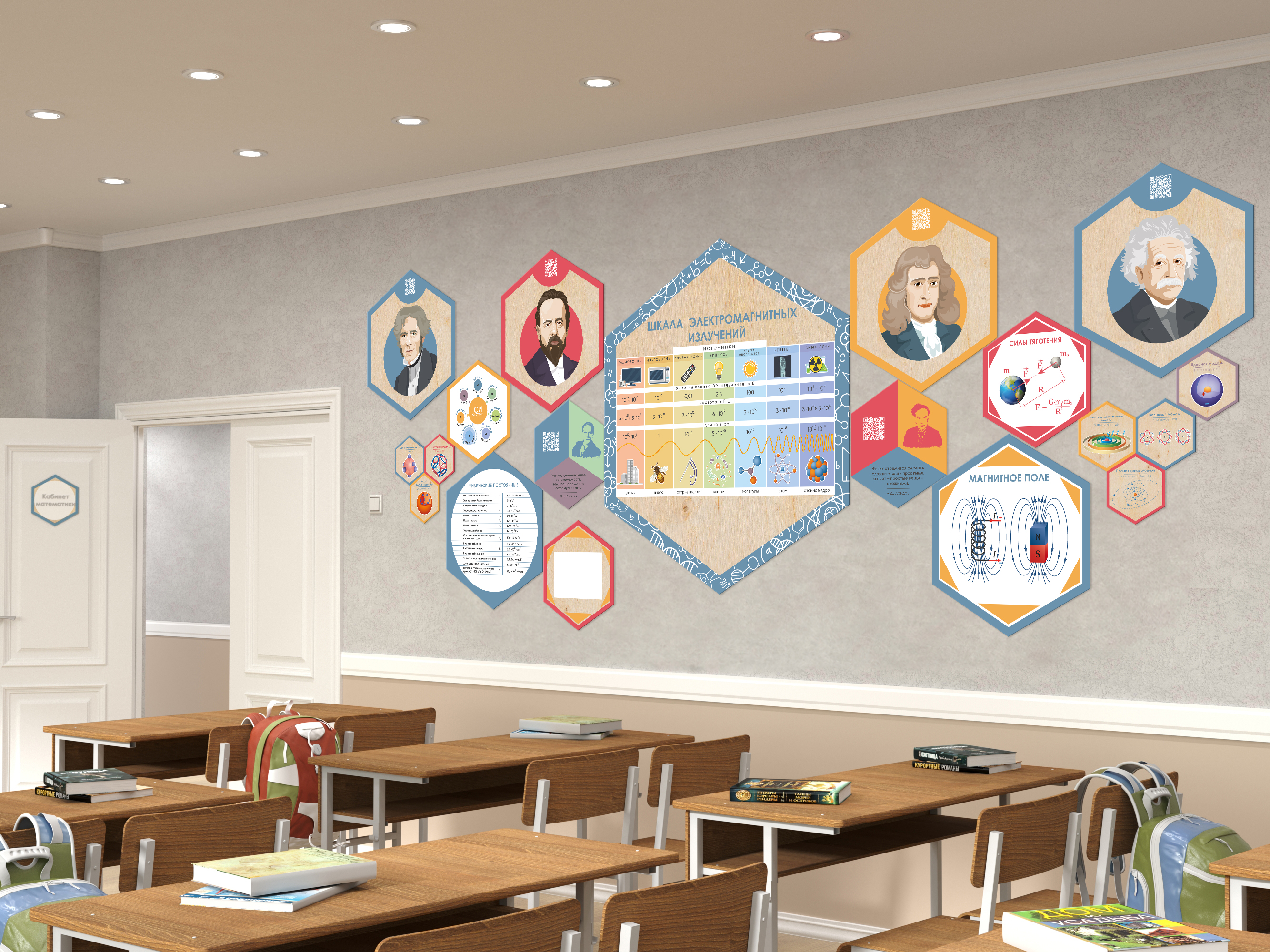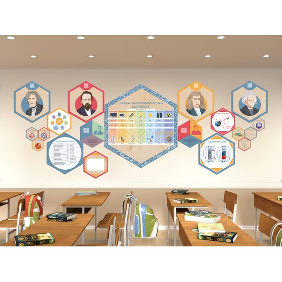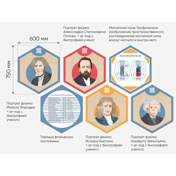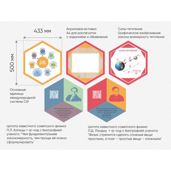 Каждый шестигранник содержит обучающую информацию: портреты выдающихся людей, их достижения и великие цитаты, основные постулаты науки, формулы, графики, теоремы. Благодаря qr-кодам дети могут подробнее узнать об учёных, изображённых на портретах, стоит только навести на них телефон.