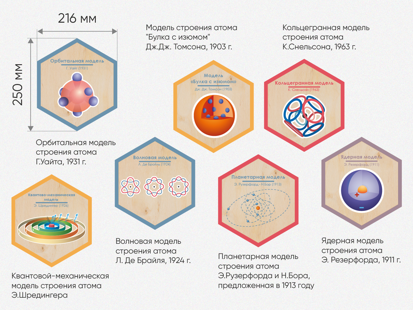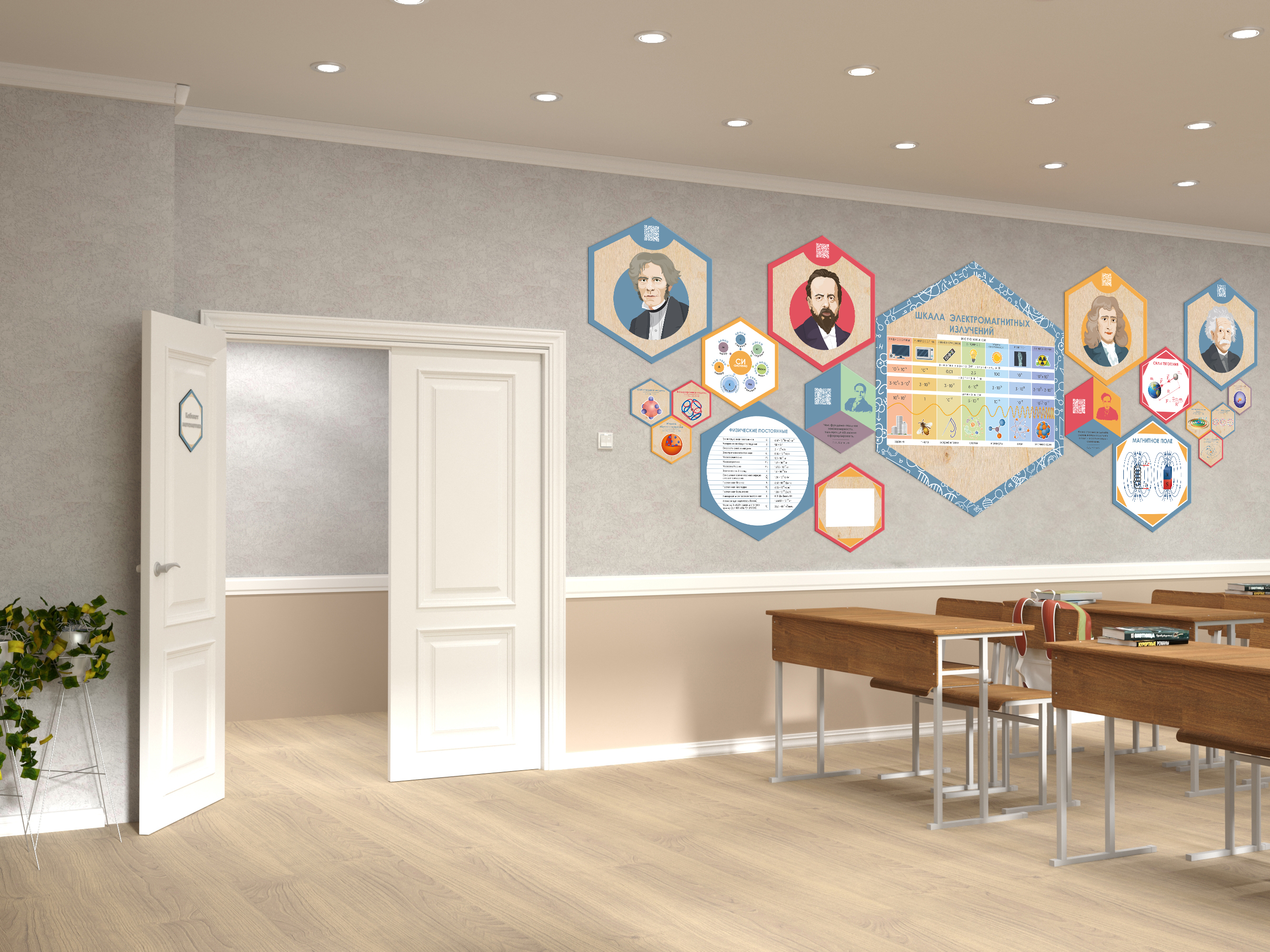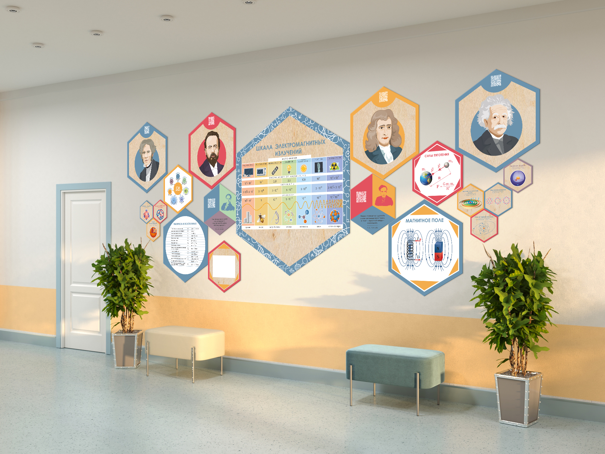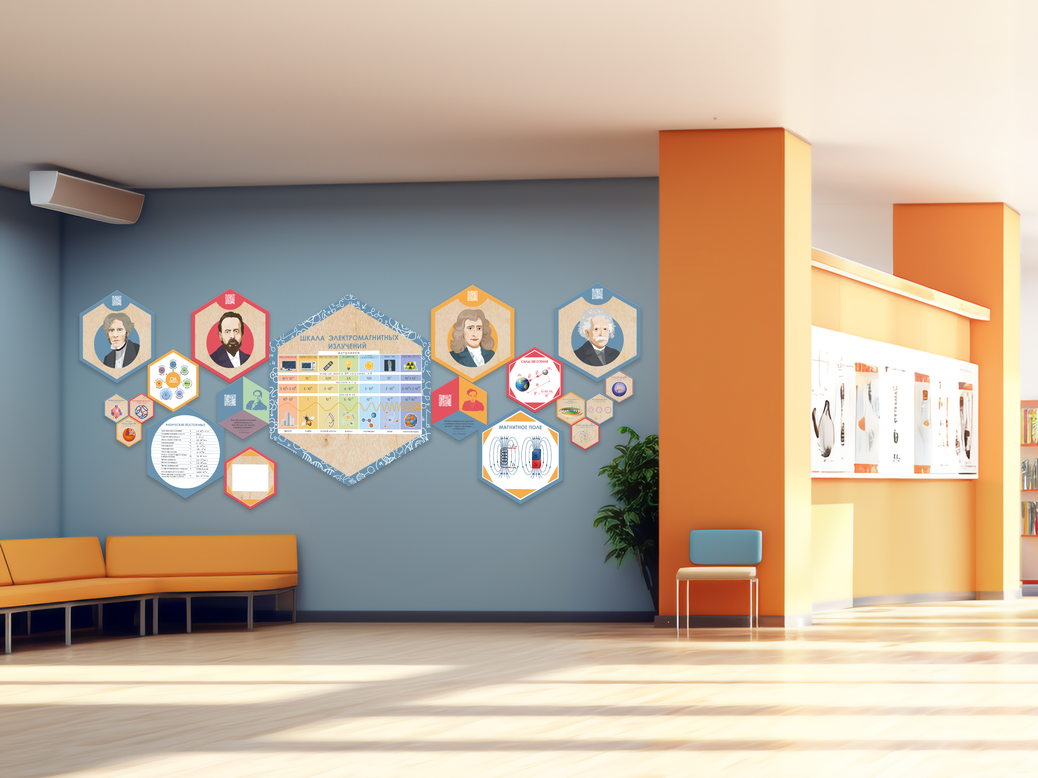 Каждый шестигранник содержит обучающую информацию: портреты выдающихся людей, их достижения и великие цитаты, основные постулаты науки, формулы, графики, теоремы. Благодаря qr-кодам дети могут подробнее узнать об учёных, изображённых на портретах, стоит только навести на них телефон.