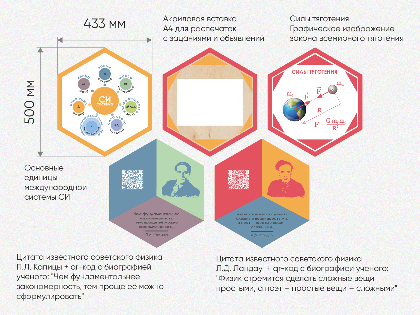 - Цитата известного советского физика П.Л. Капицы + qr-код с биографией ученого: "Чем фундаментальнее закономерность, тем проще её можно сформулировать". (500х433 мм)