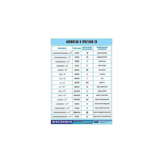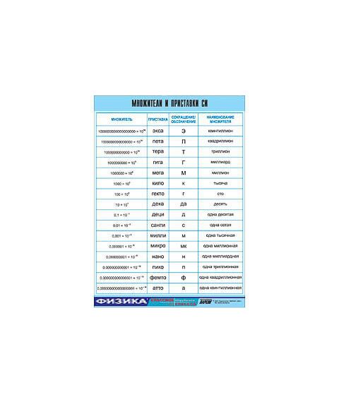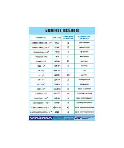Таблица демонстрационная "Множители и приставки СИ" (винил 70х100)
