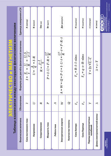 Формат 100х140 см. Электричество и магнетизм. Таблица взаимосвязи между некоторыми физическими величинами (винил).