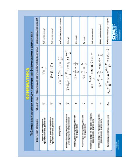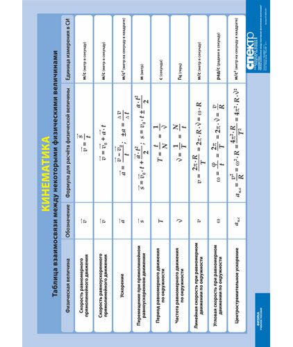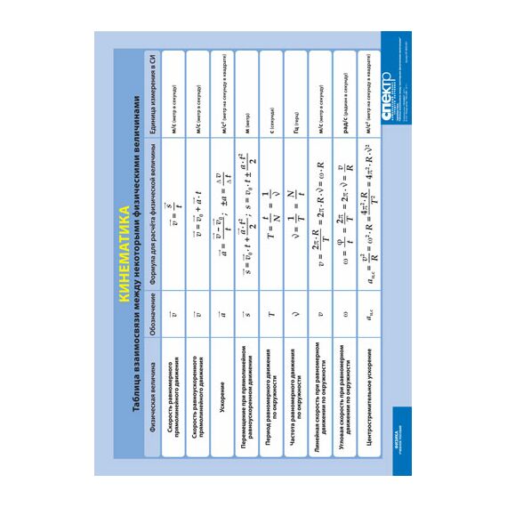 Формат 100х140 см. Кинематика. Таблица взаимосвязи между некоторыми физическими величинами (винил).