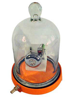 Прибор состоит из основания, выполненного в виде пластмассового диска (тарелки) на ножках и с краном, колокола из толстого стекла, резиновой прокладки и электрического звонка.
