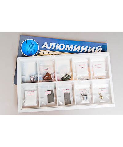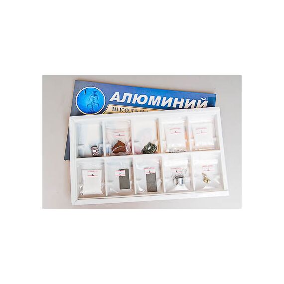 Образцы пронумерованы соответственно списку и положены в коробку с ячейками. Пособие комплектуется руководством по эксплуатации и ламинированным вкладышем, содержащим информацию о свойствах, производстве и применении алюминия.