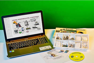 Образцы пронумерованы и помещены в коробку с ячейками. Комплектуются ламинированным вкладышем, содержащим информацию о свойствах, производстве и применении алюминия.
