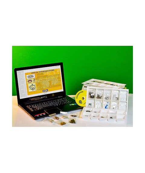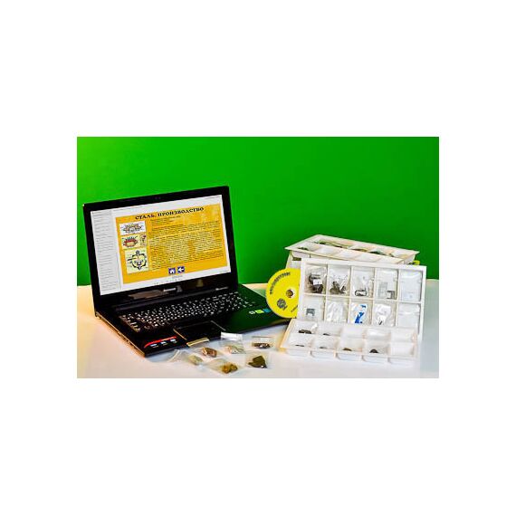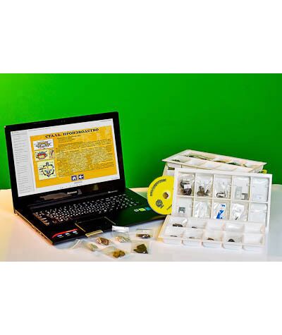 Образцы пронумерованы и упакованы в коробку с ячейками. Комплектуются ламинированными вкладышами со схемами производства чугуна и стали.