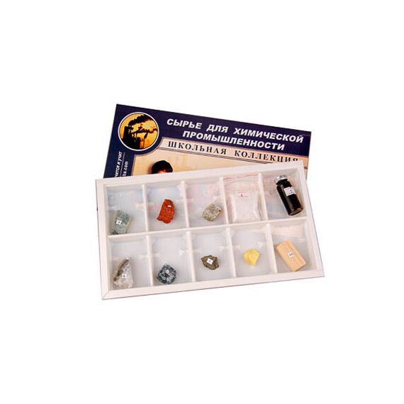 Состав коллекции: апатит, боксит (алюминий), нефелин, поваренная соль, нефть , кальцит, флюорит, пирит, сера, древесина.
