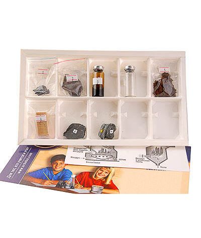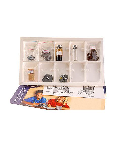 Образцы пронумерованы согласно списку и упакованы в коробку с ячейками. Пособие комплектуется руководством по эксплуатации и ламинированным вкладышем с иллюстрациями различных способов сжигания топлива.