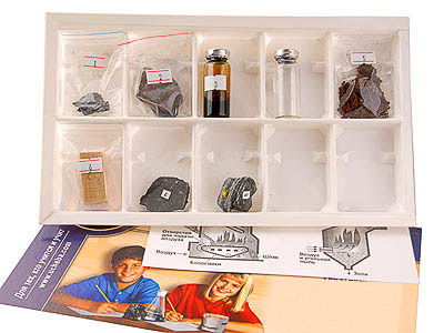 Образцы пронумерованы согласно списку и упакованы в коробку с ячейками. Пособие комплектуется руководством по эксплуатации и ламинированным вкладышем с иллюстрациями различных способов сжигания топлива.
