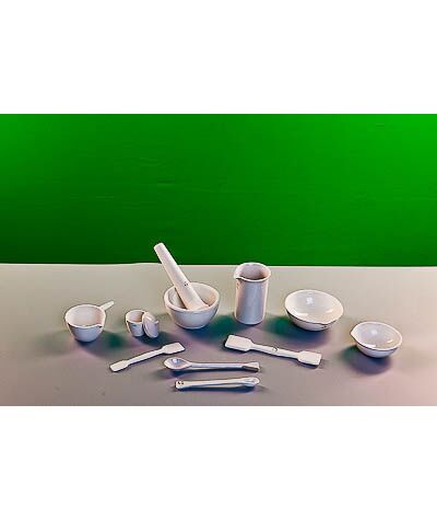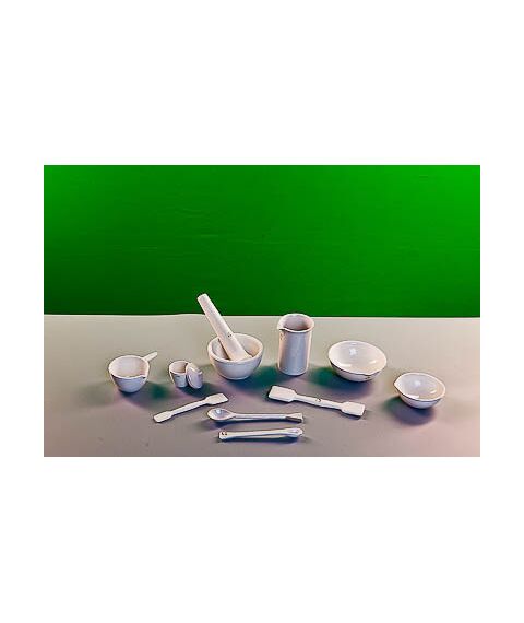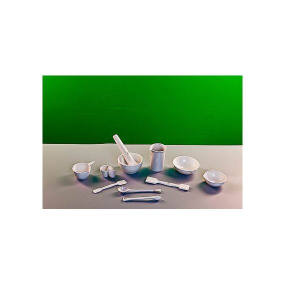 Комплектность: кастрюля с ручкой №1 – 1 шт., ложка №1 – 1 шт., ложка №2 – 1 шт., пест №3 – 1 шт., стакан №3 – 1 шт., Ступка №3 – 1 шт., тигель №3 – 1 шт., крышка к тиглю №3 – 1 шт., чашка выпарительная №2 – 1 шт., чашка выпарительная №3 – 1 шт., шпатель № 1 – 1 шт., шпатель № 2 – 1 шт. Изготовлены из фарфора