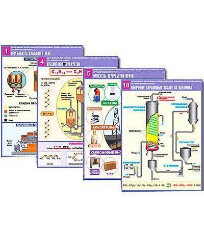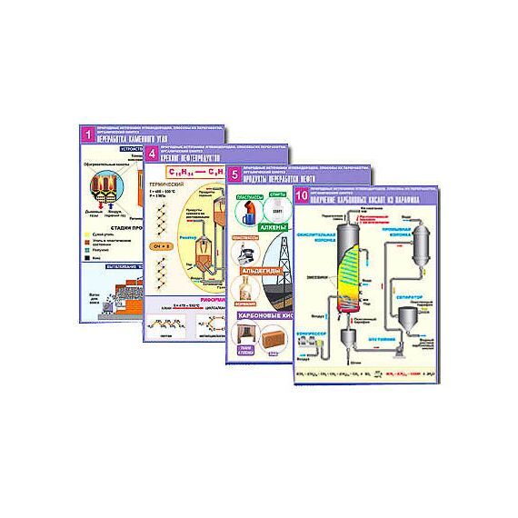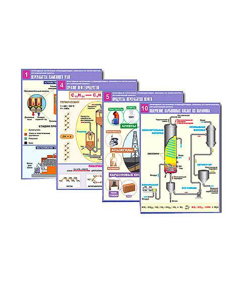 Комплект охватывает следующие темы: "Переработка каменного угля", "Коксование угля", "Перегонка нефти", "Крекинг нефтепродуктов", "Продукты переработки нефти", "Природный и попутный газ", "Получение ацетилена из метана", "Производство этанола прямой гидратацией этилена", "Получение формальдегида окислением метана", "Получение карбоновых кислот из парафина", "Автоклав для гидрирования жиров", "Мыла. Синтетические моющие средства".