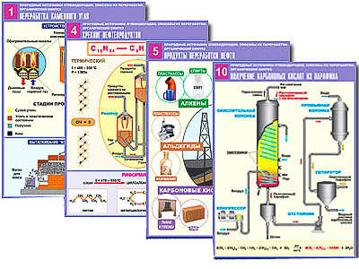 Комплект охватывает следующие темы: "Переработка каменного угля", "Коксование угля", "Перегонка нефти", "Крекинг нефтепродуктов", "Продукты переработки нефти", "Природный и попутный газ", "Получение ацетилена из метана", "Производство этанола прямой гидратацией этилена", "Получение формальдегида окислением метана", "Получение карбоновых кислот из парафина", "Автоклав для гидрирования жиров", "Мыла. Синтетические моющие средства".